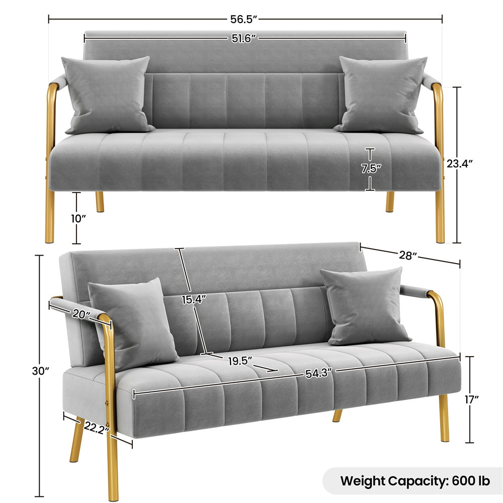 Costoffs Velvet Fabric Sofa Couch, 56.5″ W Modern Loveseat Couch with Gold-tone Metal Arms, Legs & 2 Pillows, Sofa for Living Room, Bedroom Furniture, Pink\u002FGreen\u002FGray